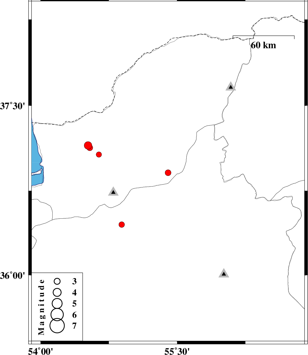 2009/11/18 | 17:57:14.2 | 21:27:14.2 | 37.13 | 54.54 | 15 | ML3 | Golestan Province, 15 km North of Aq Qaleh |