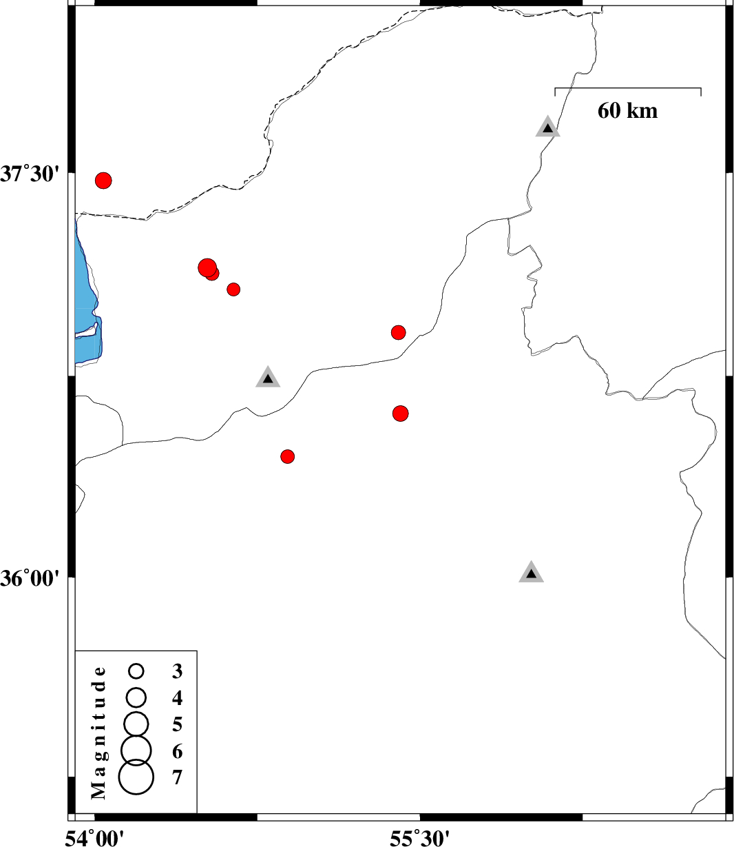 2009/12/03 | 15:05:11.0 | 18:35:11.0 | 37.15 | 54.52 | 15 | ML3.8 | Golestan Province, 16 km North of Aq Qaleh | ||
