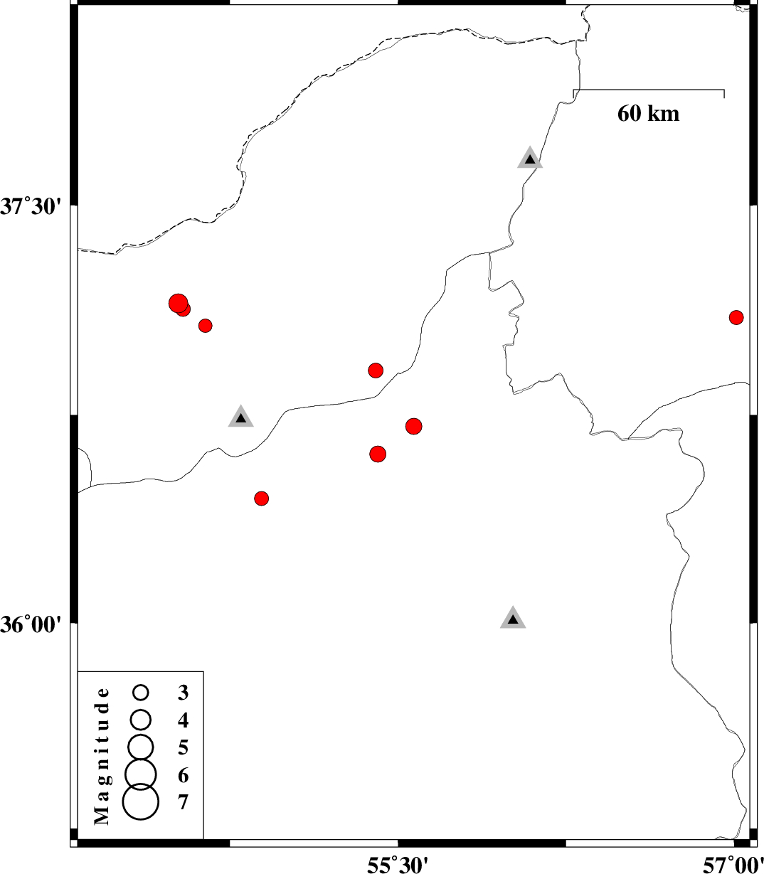 2009/11/18 | 17:57:14.2 | 21:27:14.2 | 37.13 | 54.54 | 15 | ML3 | Golestan Province, 15 km North of Aq Qaleh |
