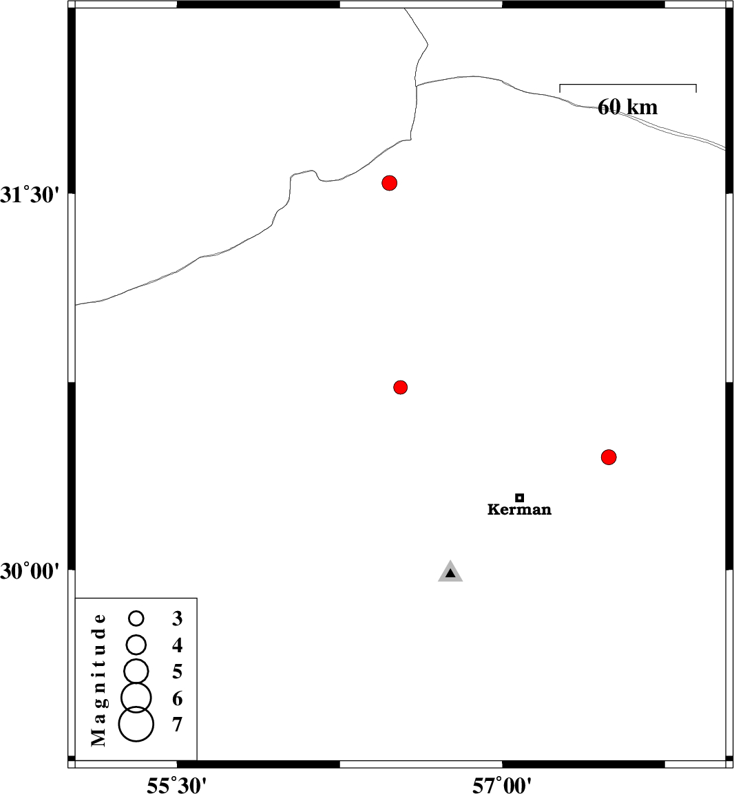 2010/03/25 | 01:49:38.1 | 06:19:38.1 | 30.45 | 57.49 | 6 | ML:3.1 | Kerman Province, 43 km North-East of Kerman |