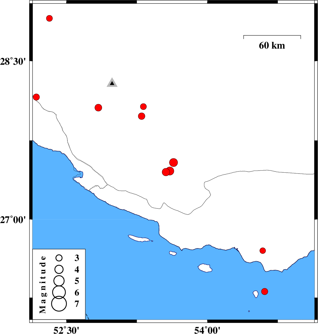 2010/04/01 07:31:59.8 12:01:59.8 27.4653.640 ML3.9 Fars Province, 45 km North-East of Lamerd