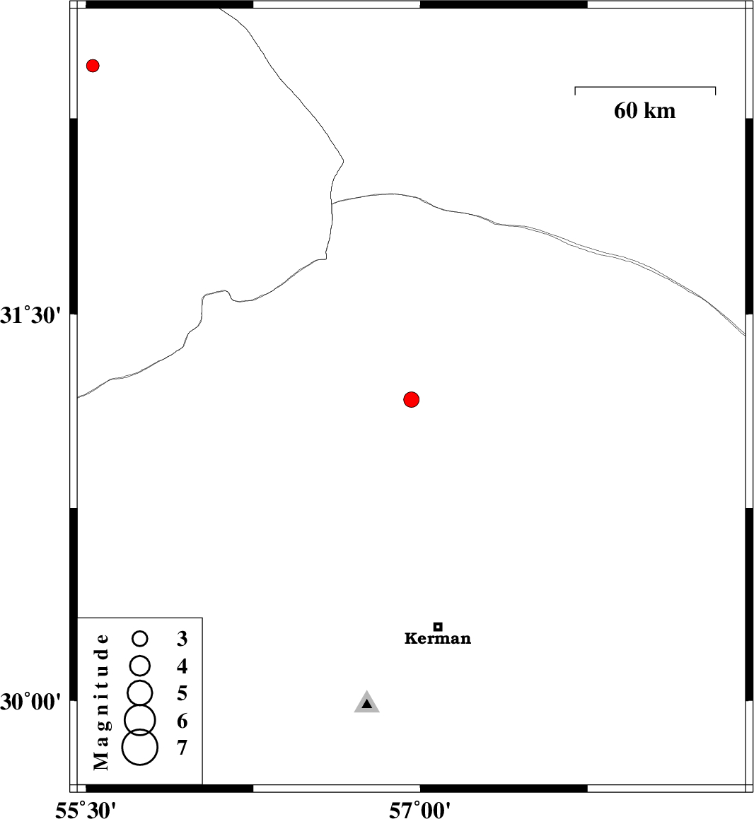 | 2010/04/11 | 00:50:08.8 | 05:20:08.8 | 31.17 | 56.96 | 25 | ML3.1 | Kerman Province, 17 km East of Ravar | ||