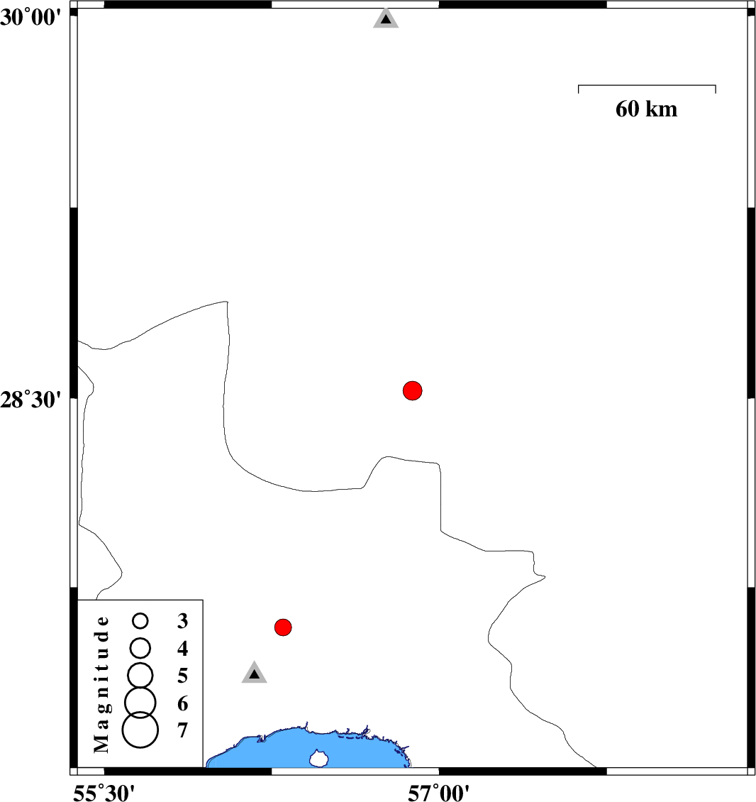 | 2010/04/11 | 13:49:13.3 | 18:19:13.3 | 28.53 | 56.88 | 14 | ML3.8 | Kerman Province, 83 km South-East of Baft | ||