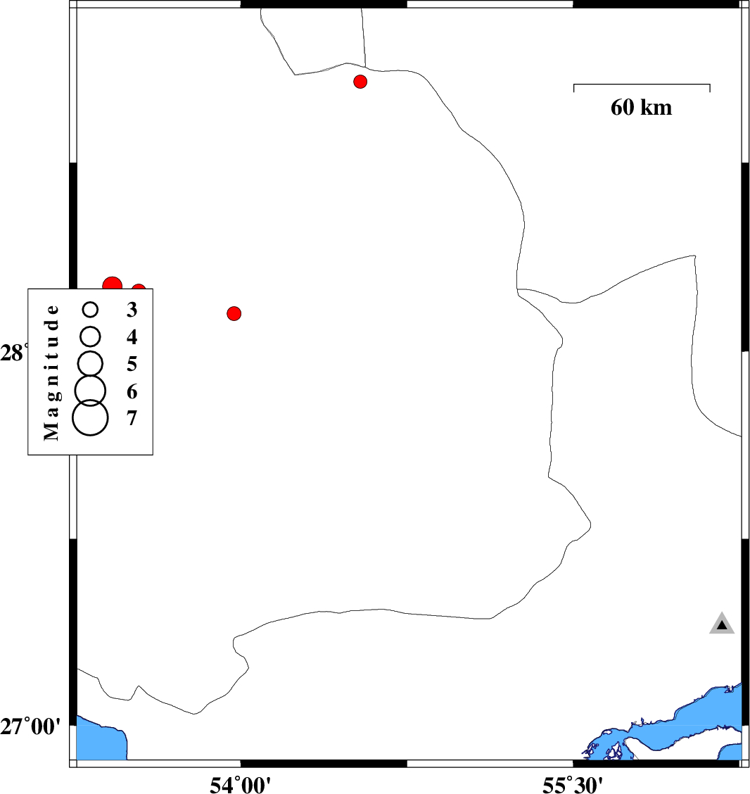 | 2010/03/27 | 00:48:01.8 | 05:18:01.8 | 28.07 | 53.32 | 43 | ML2.9 | Fars Province, 53 km South-West of Jahrom | ||