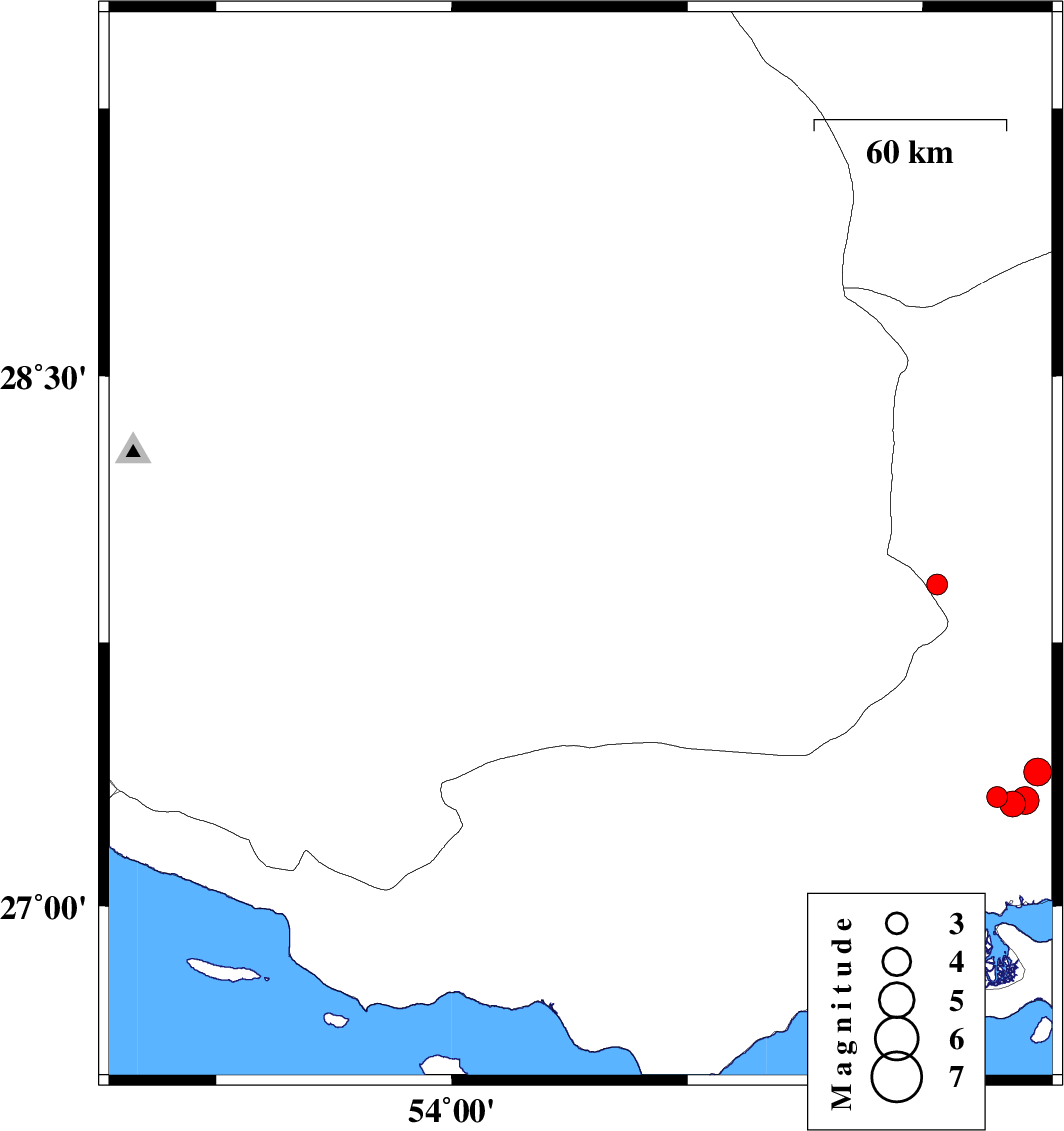 | 2010/04/04 | 16:23:03.1 | 20:53:03.1 | 27.47 | 53.51 | 40 | ML2.9 | Fars Province, 37 km North-East of Lamerd | ||