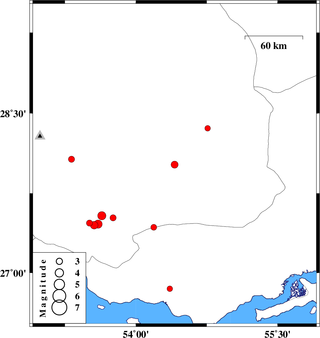| 2010/04/07 | 16:30:19.4 | 21:00:19.4 | 27.52 | 53.76 | 18 | ML3 | Fars Province, 59 km South-West of Lar | ||