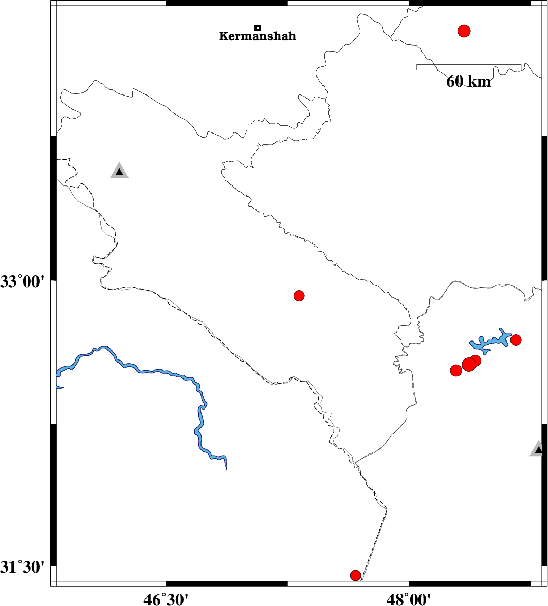 | 2010/04/17 | 05:59:17.2 | 10:29:17.2 | 32.92 | 47.32 | 46 | ML2.9 | Ilam Province, 13 km West of Abdanan | ||