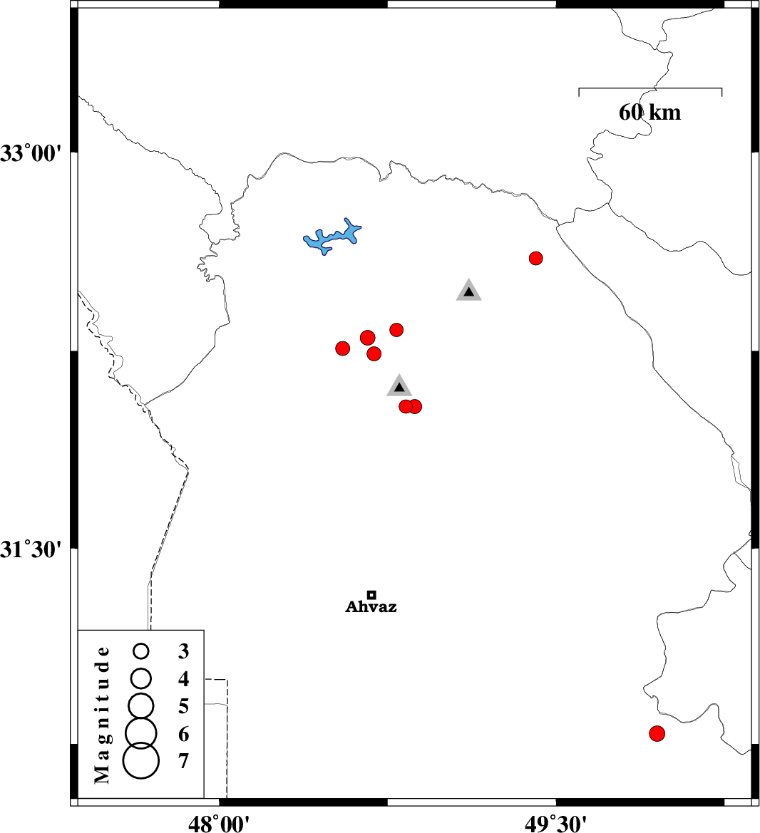 | 2010/04/20 | 04:38:32.8 | 09:08:32.8 | 32.6 | 49.41 | 6 | ML2.7 | Khoozestan Province, 37 km North-East of Lali |