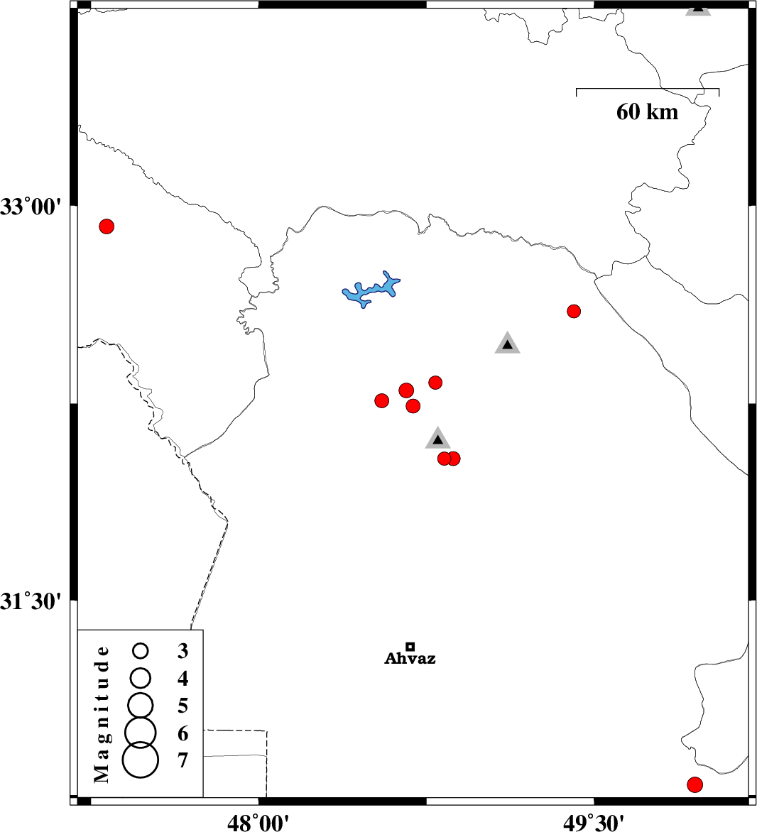 | 2010/04/20 | 11:39:43.2 | 16:09:43.2 | 30.79 | 49.95 | 14 | ML3.1 | Khoozestan Province, 24 km East of Omidiyeh | ||
