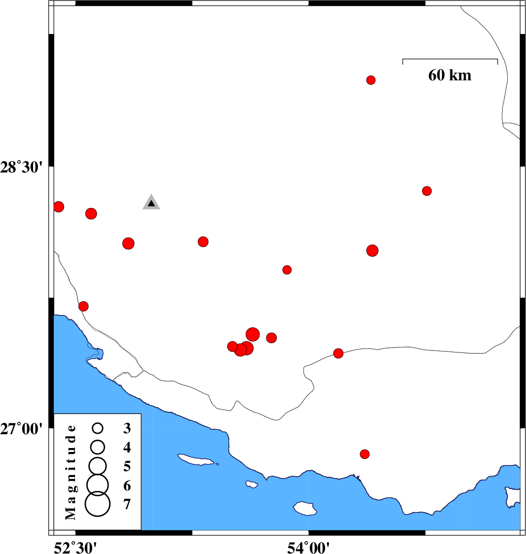 | 2010/04/07 | 16:30:19.4 | 21:00:19.4 | 27.52 | 53.76 | 18 | ML3 | Fars Province, 59 km South-West of Lar | ||