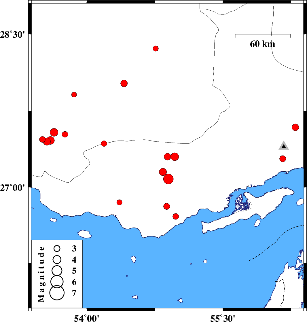 | 2010/04/28 | 09:45:24.3 | 14:15:24.3 | 26.71 | 54.98 | 46 | ML3 | Hormozgan Province, 24 km North-East of Bandar-e lengeh | ||