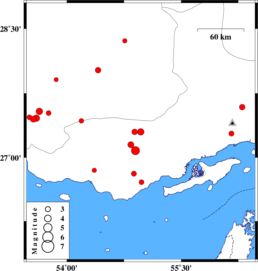 | 2010/04/27 | 22:58:00.7 | 03:28:00.7 | 27.08 | 54.9 | 32 | ML5 | Hormozgan Province, 62 km North of Bandar-e lengeh | ||