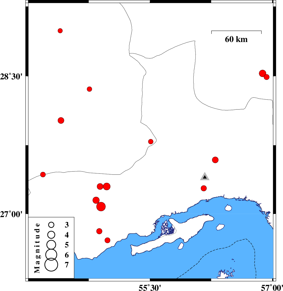 | 2010/04/28 | 09:45:24.3 | 14:15:24.3 | 26.71 | 54.98 | 46 | ML3 | Hormozgan Province, 24 km North-East of Bandar-e lengeh | ||