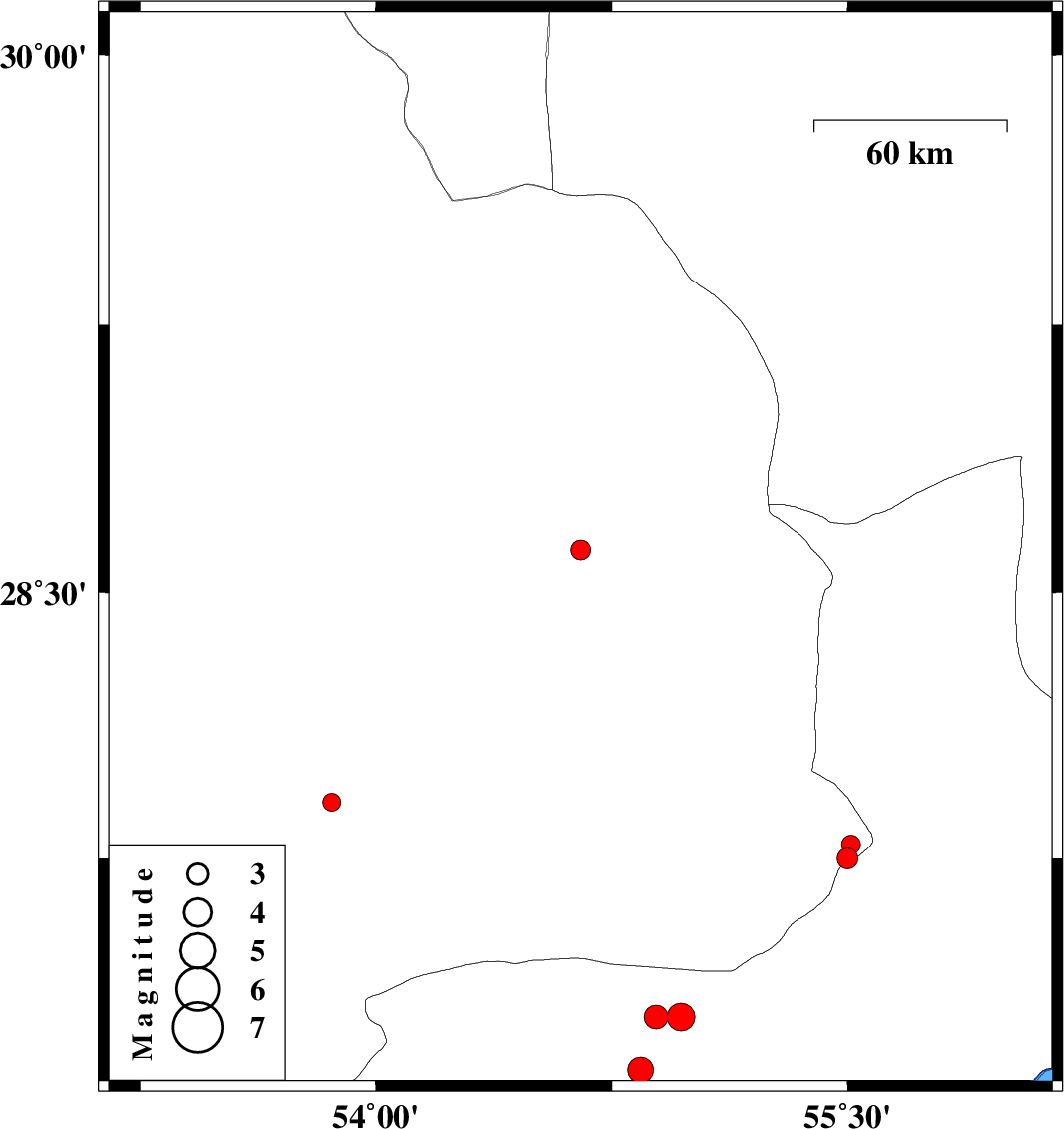 | 2010/04/28 | 13:06:37.9 | 17:36:37.9 | 27.3 | 54.97 | 18 | ML3.9 | Hormozgan Province, 61 km North-East of Bastak | ||