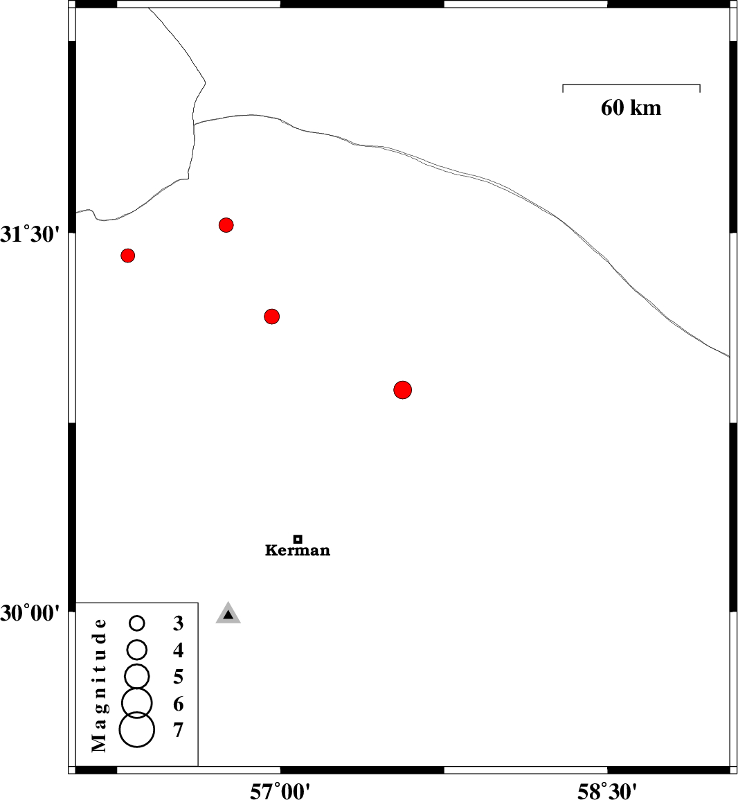 | 2010/04/11 | 00:50:08.8 | 05:20:08.8 | 31.17 | 56.96 | 25 | ML3.1 | Kerman Province, 17 km East of Ravar |