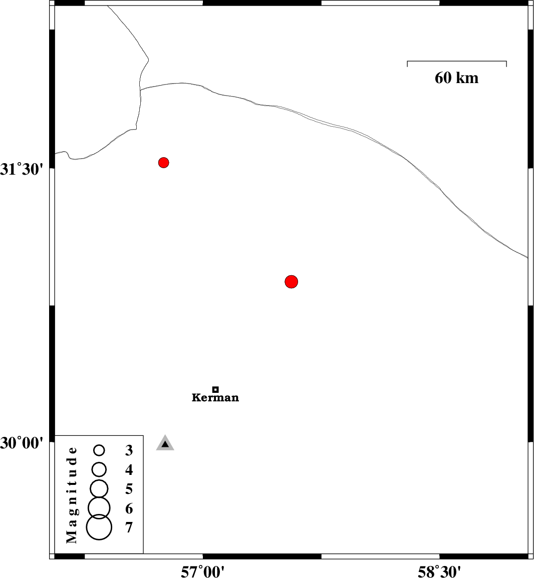 | 2010/04/26 | 14:45:37.7 | 19:15:37.7 | 31.53 | 56.75 | 18 | ML3 | Kerman Province, 29 km North of Ravar |