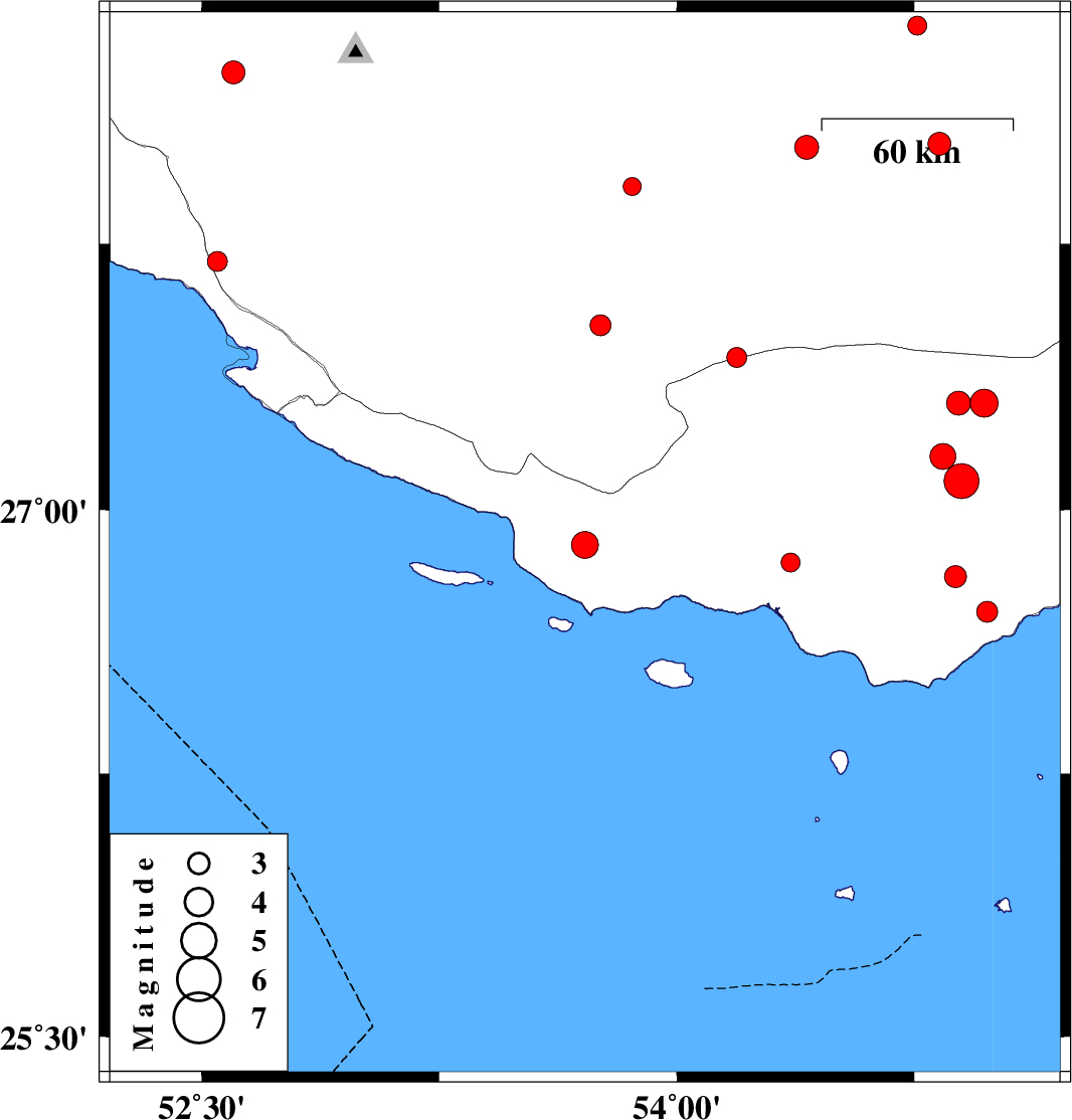 | 2010/04/27 | 22:58:00.7 | 03:28:00.7 | 27.08 | 54.9 | 32 | ML5 | Hormozgan Province, 62 km North of Bandar-e lengeh | ||