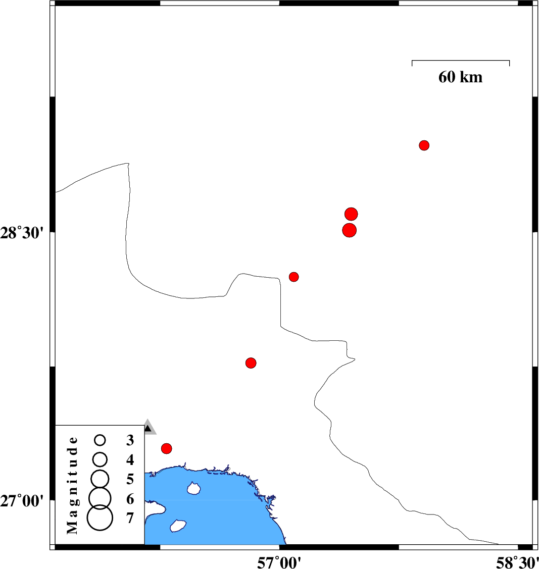 | 2010/04/29 | 21:13:20.6 | 01:43:20.6 | 28.6 | 57.45 | 17 | ML3.6 | Kerman Province, 30 km West of Jiroft |