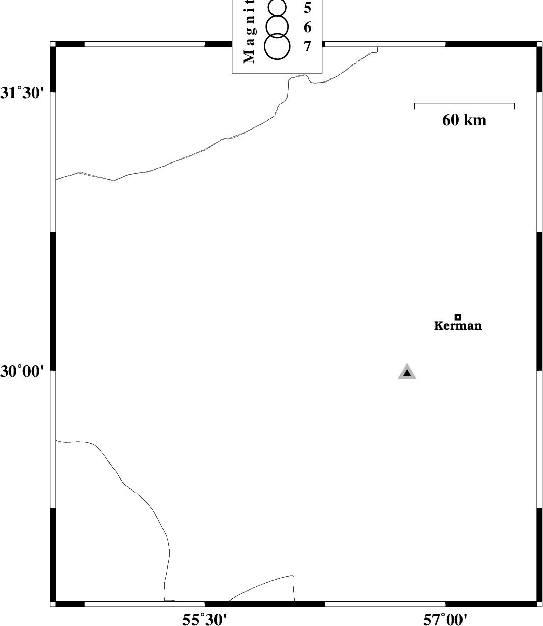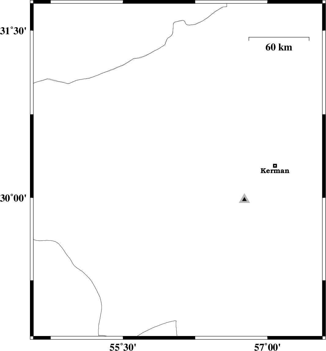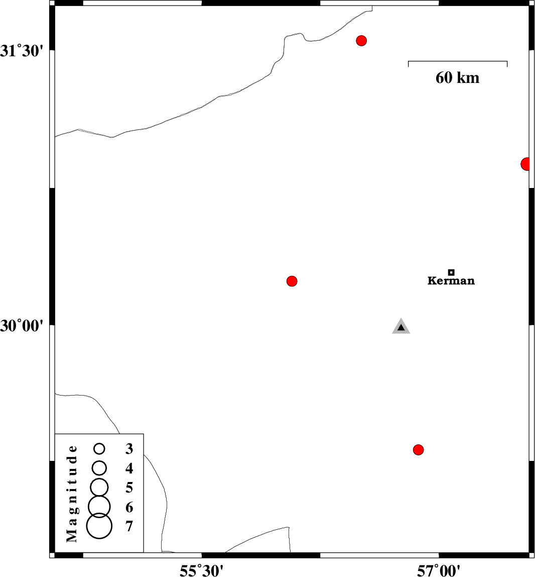 | 2010/05/07 | 19:32:30.2 | 00:02:30.2 | 30.24 | 56.07 | 18 | ML3 | Kerman Province, 19 km South of Rafsanjan | ||