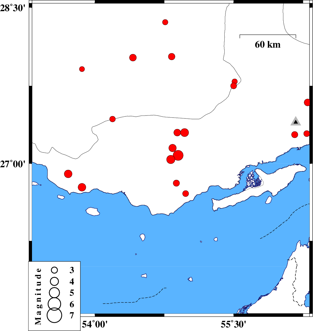 | 2010/04/28 | 09:45:24.3 | 14:15:24.3 | 26.71 | 54.98 | 46 | ML3 | Hormozgan Province, 24 km North-East of Bandar-e lengeh | ||