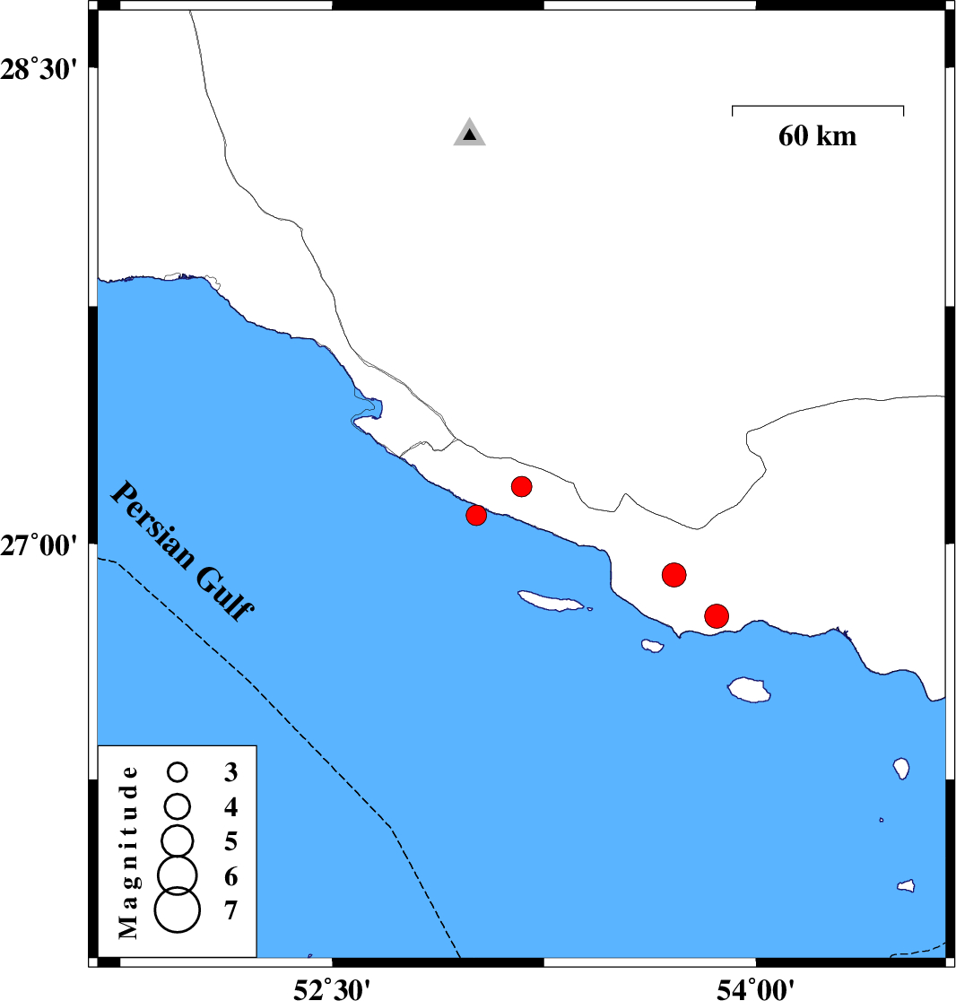 | 2010/05/06 | 15:07:11.3 | 19:37:11.3 | 26.77 | 53.86 | 16 | ML3.8 | Hormozgan Province, 69 km South-West of Bastak | ||