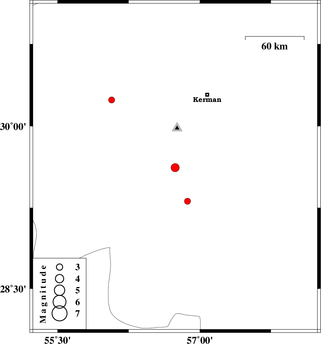 | 2010/05/07 | 19:32:30.2 | 00:02:30.2 | 30.24 | 56.07 | 18 | ML3 | Kerman Province, 19 km South of Rafsanjan | ||