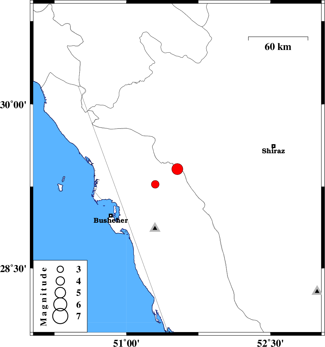 | 2010/05/07 | 16:09:51.7 | 20:39:51.7 | 29.27 | 51.3 | 14 | ML3.7 | Bushehr Province, 9 km Borazjan |
