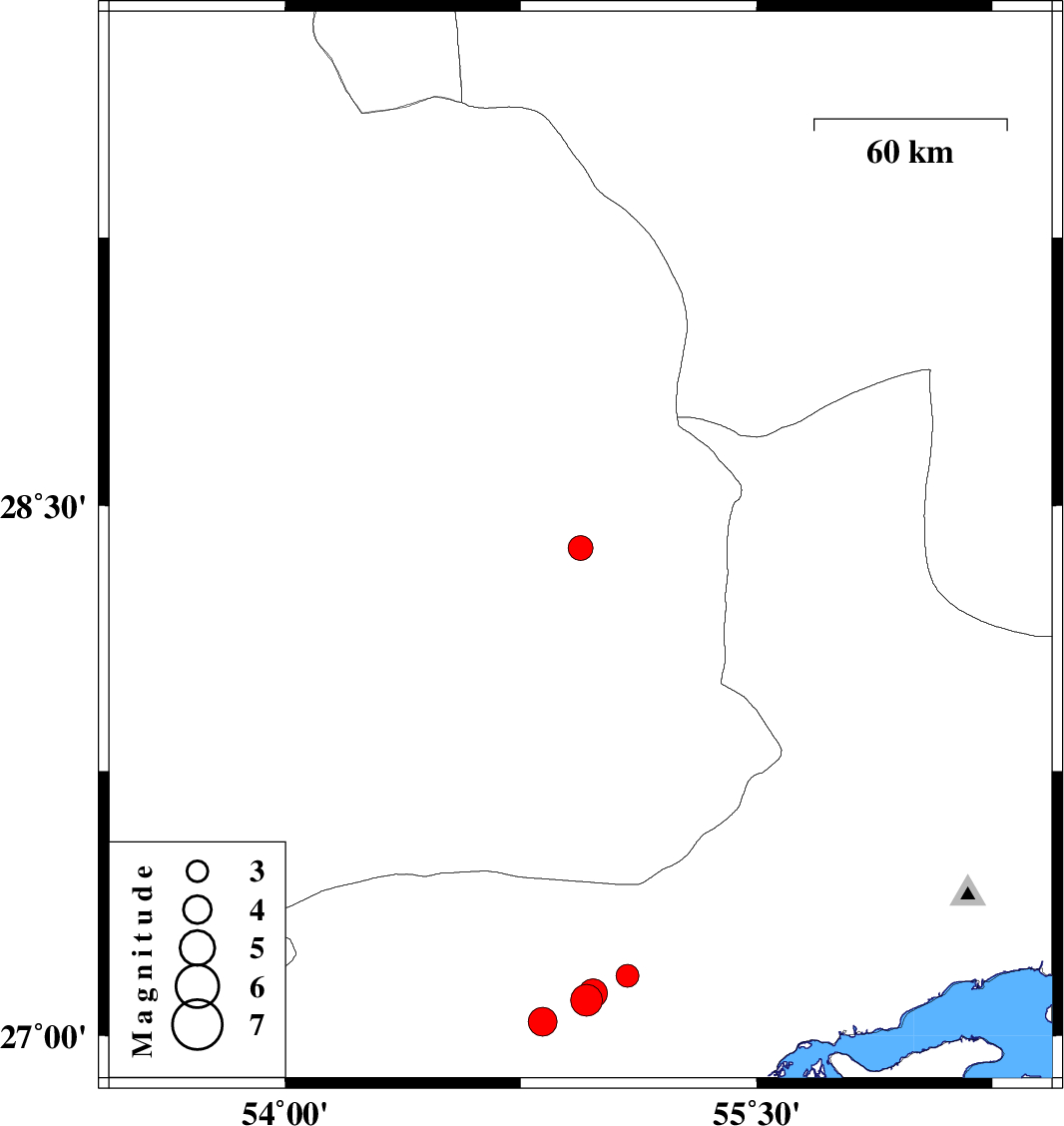 | 2010/05/09 | 03:10:10.2 | 07:40:10.2 | 27.04 | 54.82 | 31 | ML4.1 | Hormozgan Province, 57 km North of Bandar-e lengeh |