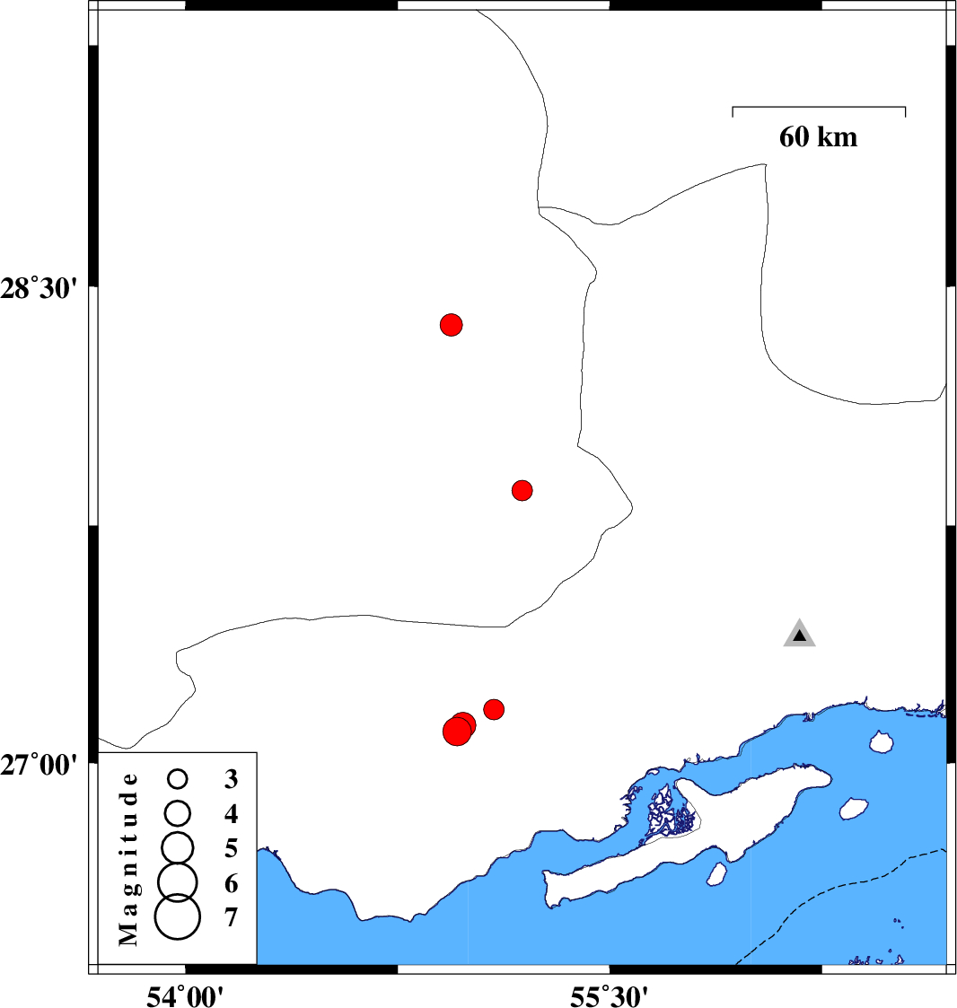 | 2010/05/12 | 17:29:11.3 | 21:59:11.3 | 27.12 | 54.98 | 36 | ML4.1 | Hormozgan Province, 62 km East of Bastak |