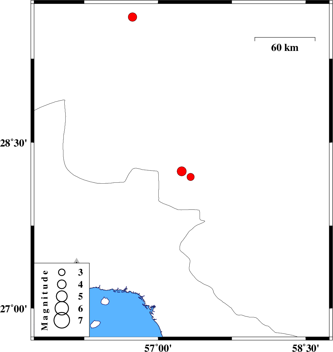 | 2010/05/20 | 12:38:26.6 | 17:08:26.6 | 28.19 | 57.33 | 45 | ML3.4 | Kerman Province, 45 km North-West of Kahnuj | ||