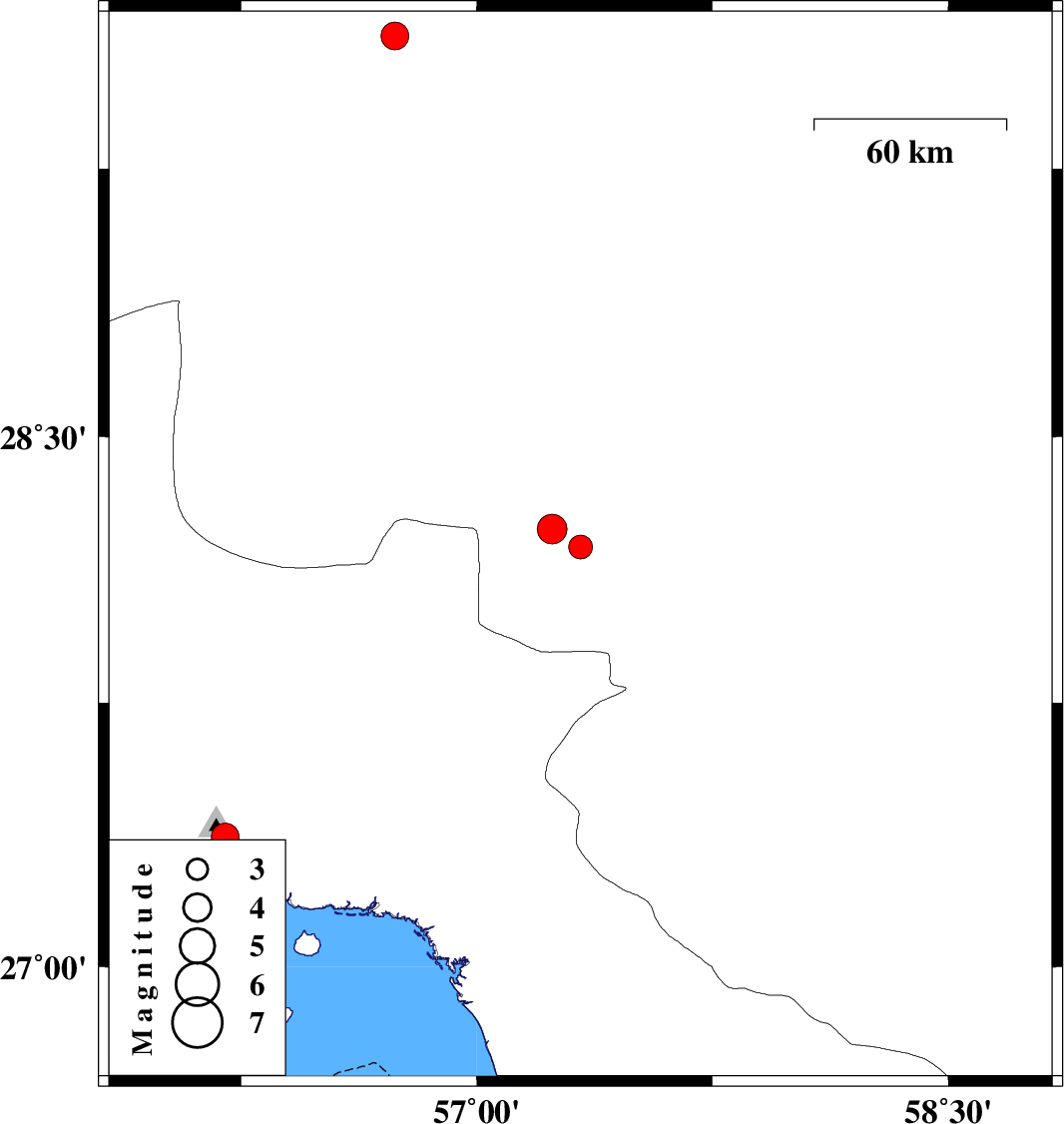 | 2010/05/20 | 12:38:26.6 | 17:08:26.6 | 28.19 | 57.33 | 45 | ML3.4 | Kerman Province, 45 km North-West of Kahnuj | ||