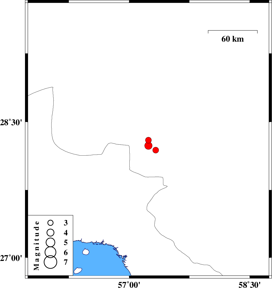 | 2010/05/22 | 14:45:31.7 | 19:15:31.7 | 28.3 | 57.24 | 15 | ML3.4 | Kerman Province, 59 km North-West of Kahnuj | ||