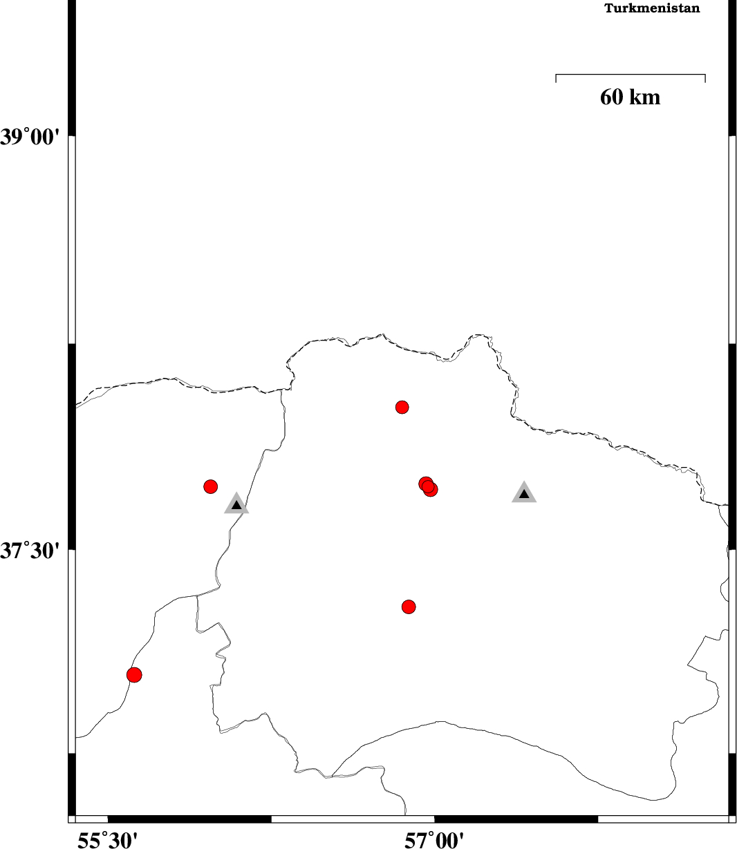 2010/05/22 | 19:14:39.1 | 23:44:39.1 | 37.29 | 56.88 | 46 | ML:2.8 | Khorasan(north) Province, 30 km South of Ashkhaneh | ||