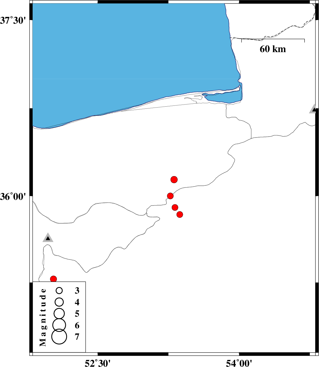 2010/05/24 | 10:30:05.5 | 15:00:05.5 | 36 | 53.27 | 14 | ML:2.9 | Mazandaran Province, 23 km South-East of Pol-E-Sefid | ||