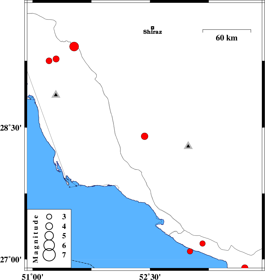 | 2010/05/14 | 18:49:54.8 | 23:19:54.8 | 29.41 | 51.53 | 15 | ML5.2 | Bushehr Province, 26 km South-West of Kazerun | ||