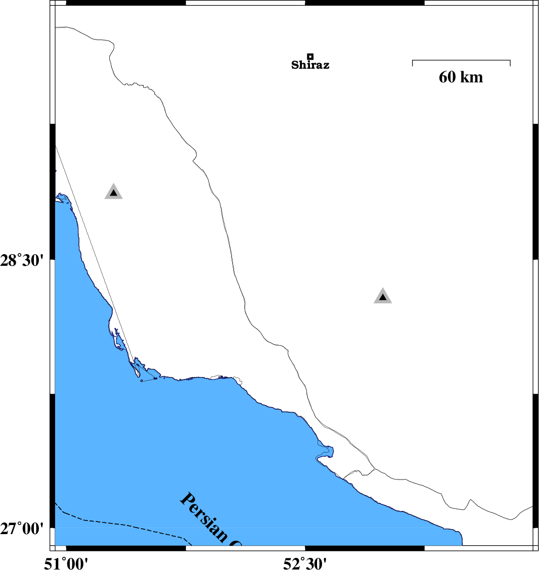 | 2010/05/28 | 07:23:40.1 | 11:53:40.1 | 28.4 | 52.43 | 14 | ML3.9 | Fars Province, 50 km South-West of Firuz Abad |