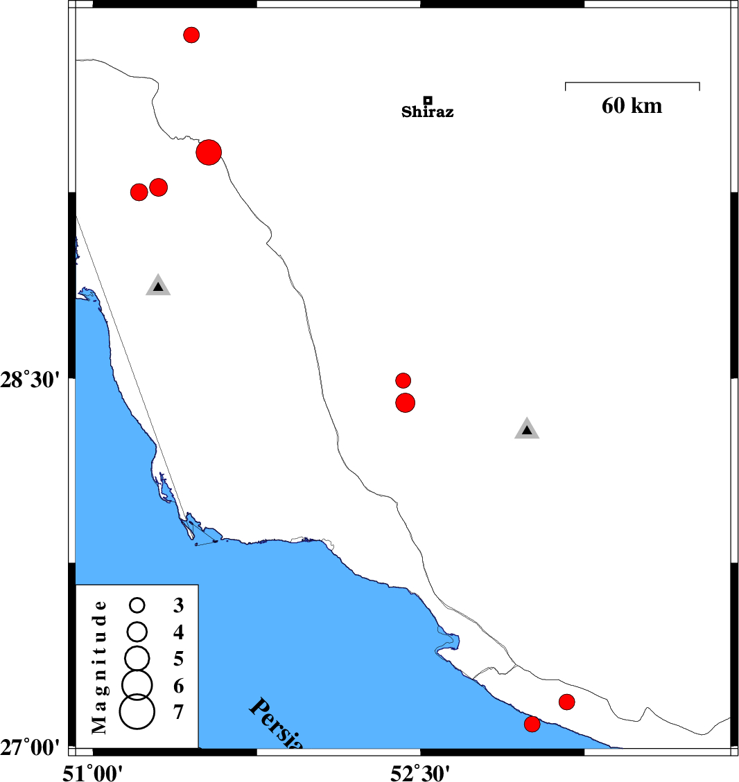 | 2010/05/07 | 16:09:51.7 | 20:39:51.7 | 29.27 | 51.3 | 14 | ML3.7 | Bushehr Province, 9 km Borazjan |