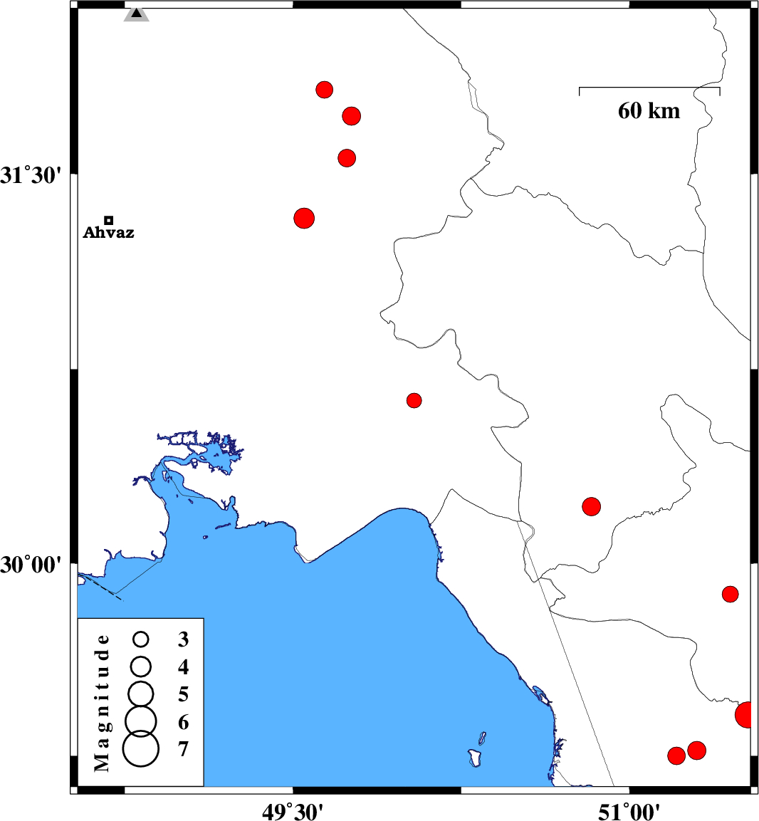 | 2010/06/02 | 18:56:19.8 | 23:26:19.8 | 30.63 | 50.04 | 33 | ML3 | Khoozestan Province, 20 km West of Behbahan | ||