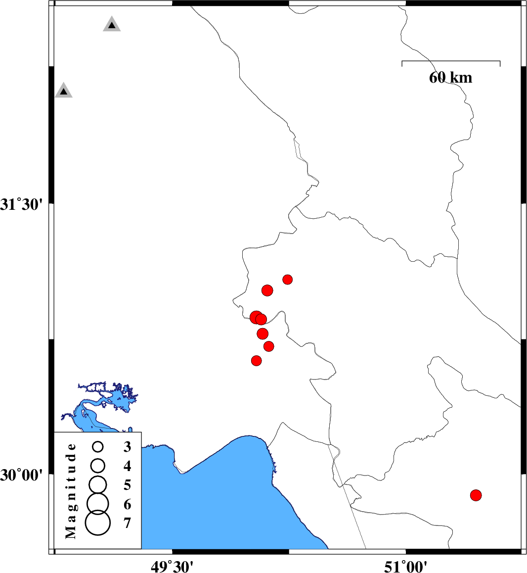 | 2010/06/02 | 18:56:19.8 | 23:26:19.8 | 30.63 | 50.04 | 33 | ML3 | Khoozestan Province, 20 km West of Behbahan | ||
