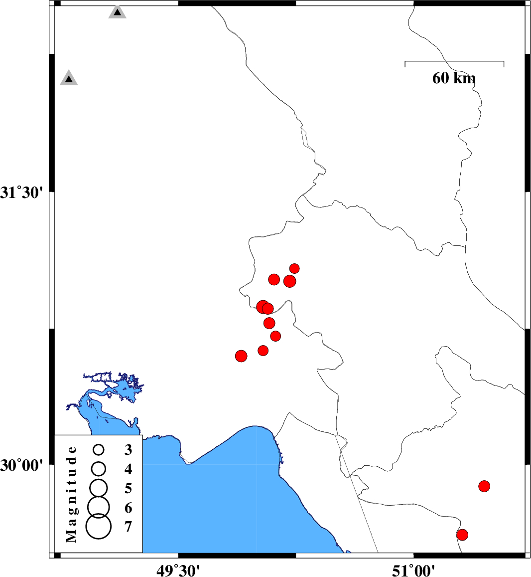 | 2010/06/07 | 06:00:27.8 | 10:30:27.8 | 30.86 | 50.07 | 35 | ML3.3 | Kohkiluieh va boyerahmad Province, 34 km North-West of Behbahan | ||