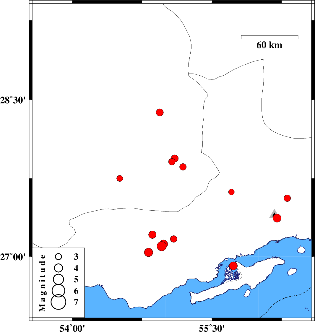 2010/05/19 19:41:46.5 00:11:46.5 27.3756.227 ML3.9 Hormozgan Province, 22 km North of Bandar-e abbas