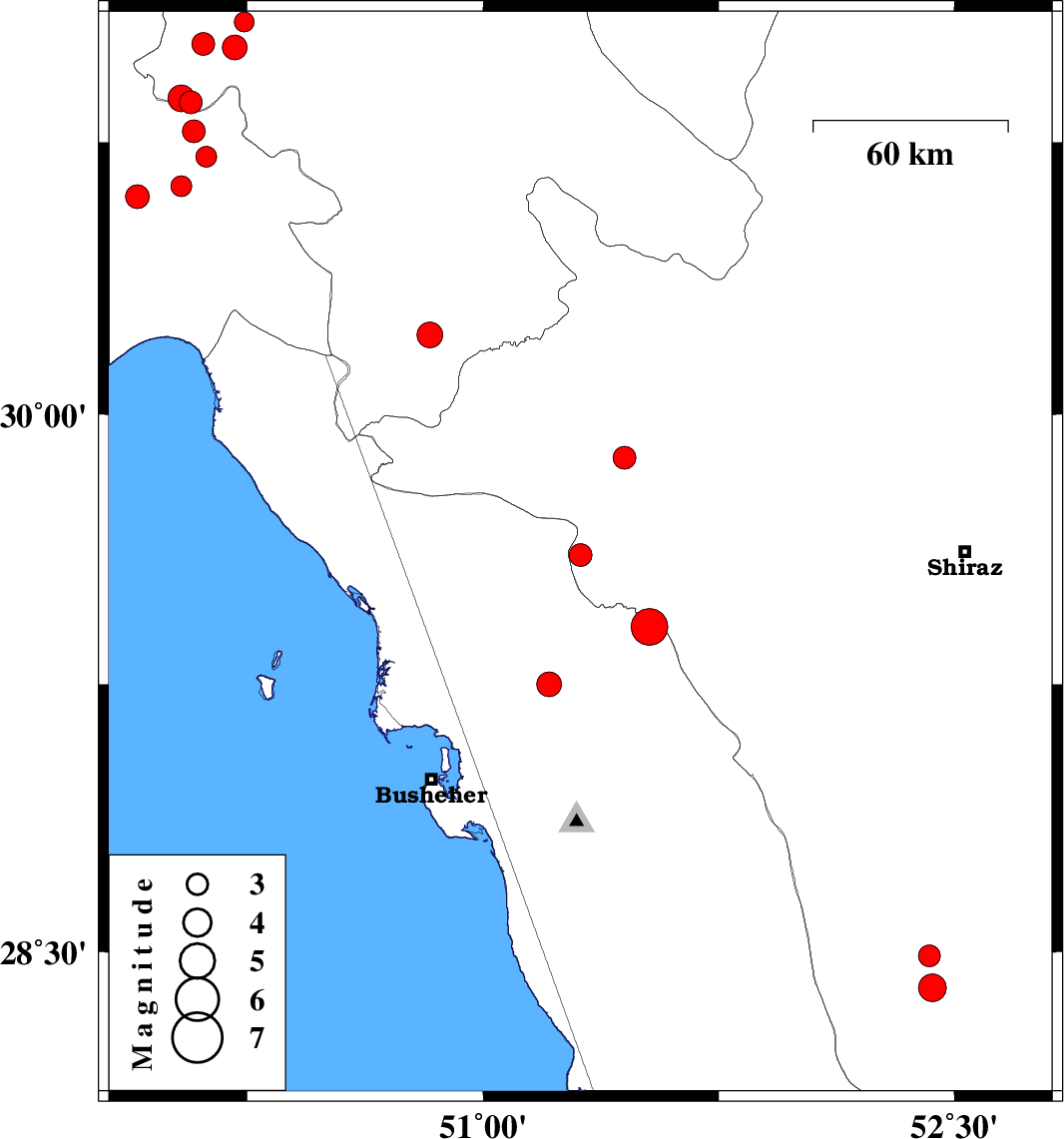 | 2010/05/14 | 18:49:54.8 | 23:19:54.8 | 29.41 | 51.53 | 15 | ML5.2 | Bushehr Province, 26 km South-West of Kazerun |