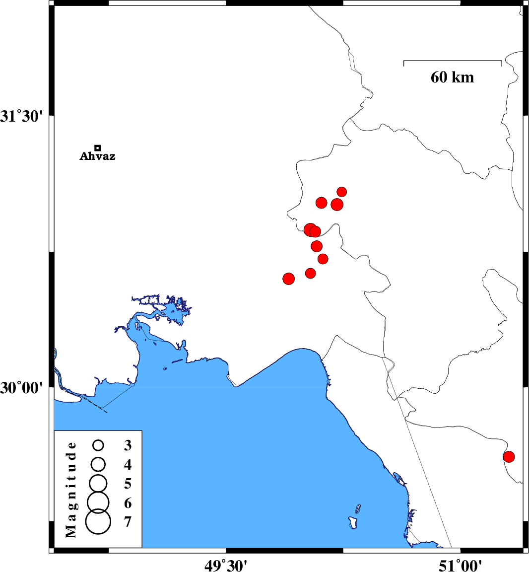| 2010/06/07 | 02:28:10.2 | 06:58:10.2 | 30.87 | 50.04 | 26 | ML3.8 | Kohkiluieh va boyerahmad Province, 34 km North-East of Omidiyeh | ||