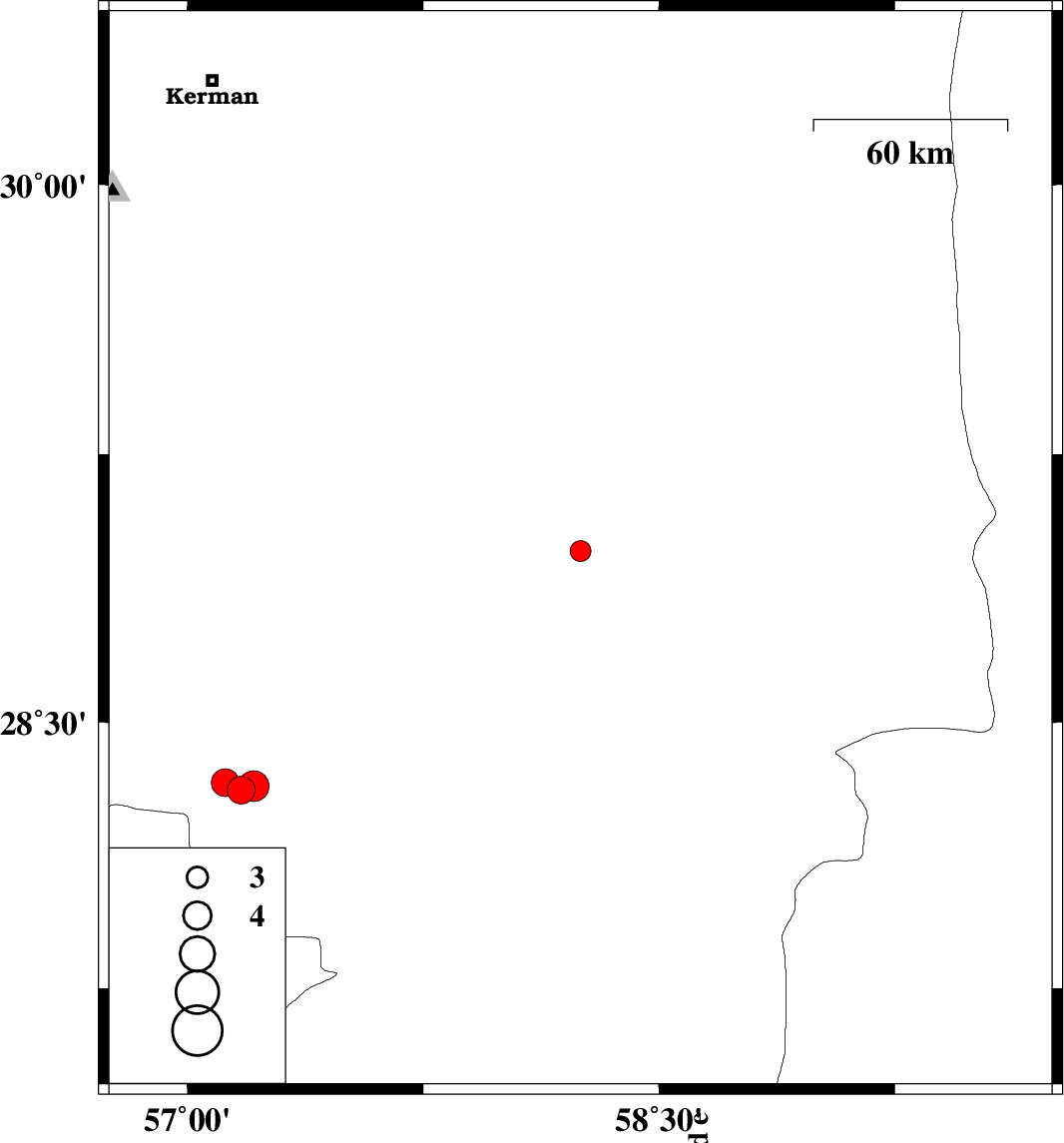 | 2010/06/14 | 04:13:45.8 | 08:43:45.8 | 28.33 | 57.12 | 15 | ML4 | Kerman Province, 70 km North-West of Kahnuj |