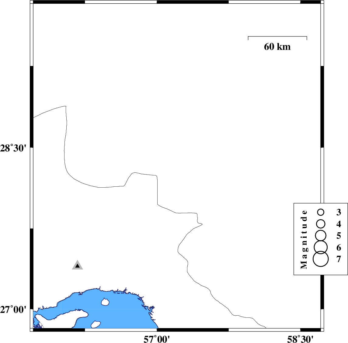 | 2010/06/14 | 04:13:45.8 | 08:43:45.8 | 28.33 | 57.12 | 15 | ML4 | Kerman Province, 70 km North-West of Kahnuj |