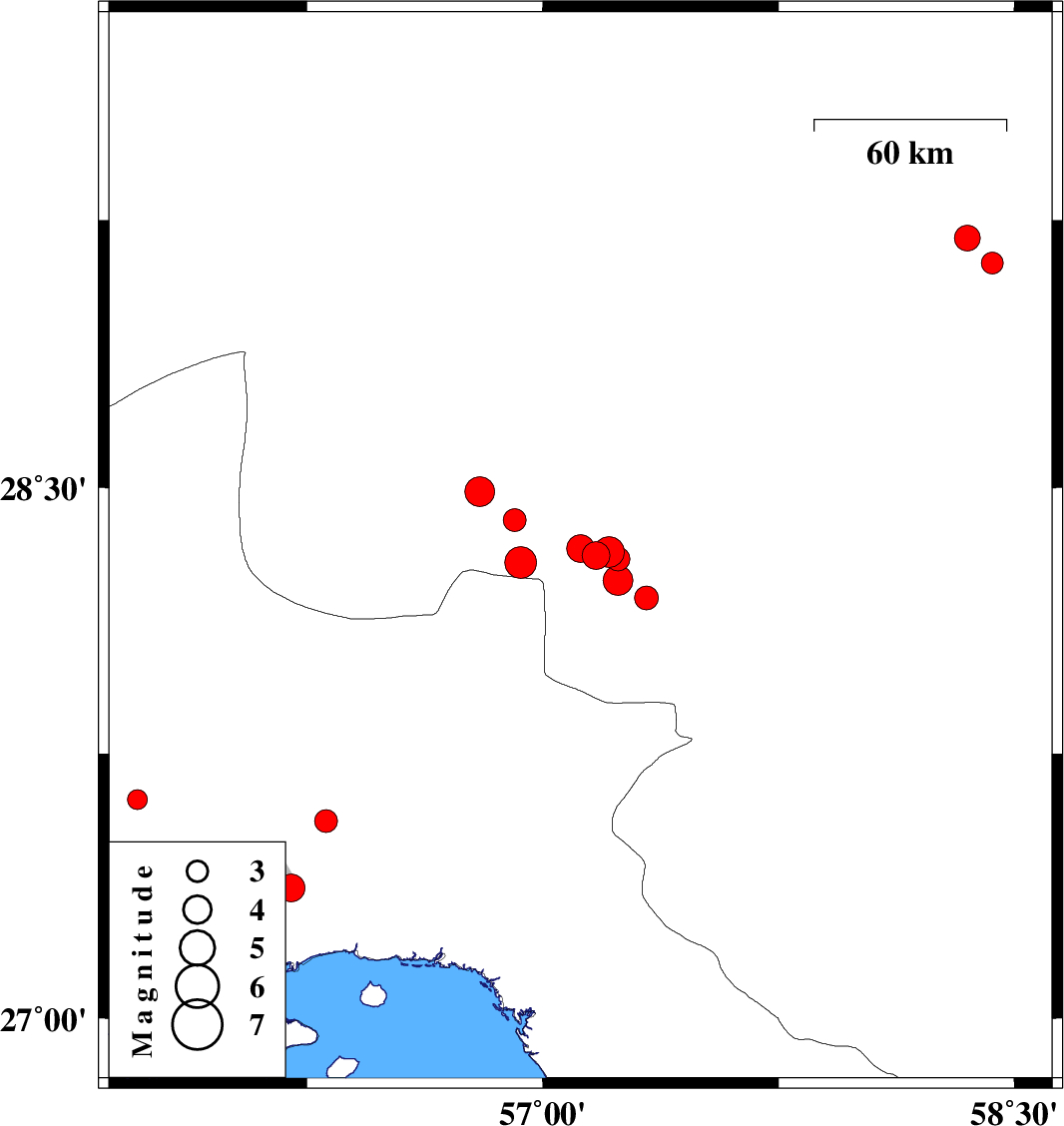2010/06/14 04:13:45.8 08:43:45.8 28.3357.1215 ML4 Kerman Province, 70 km North-West of Kahnuj