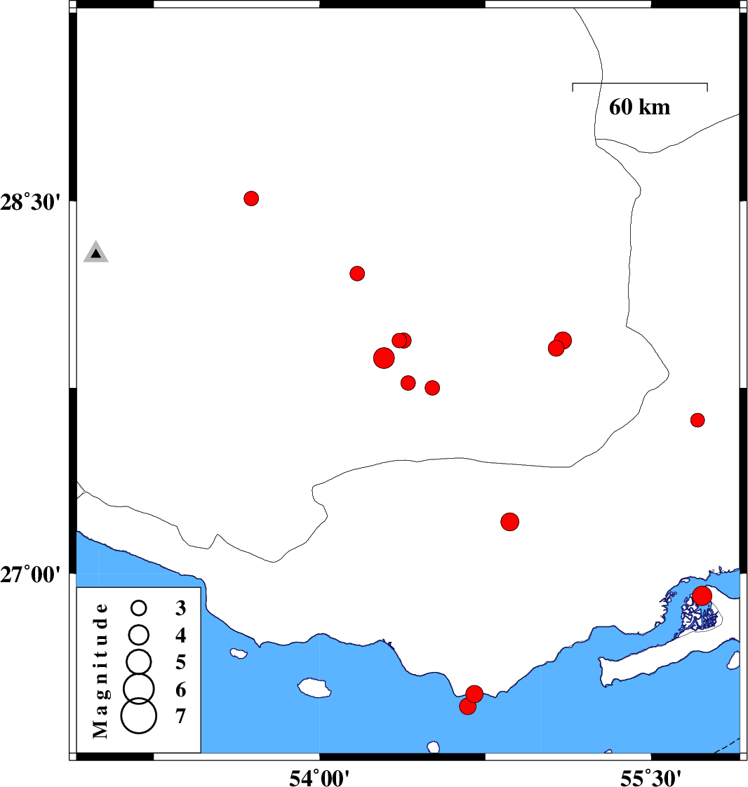 | 2010/05/28 | 11:16:55.1 | 15:46:55.1 | 26.91 | 55.73 | 6 | ML4 | Persian Gulf, 53 km West of Qeshm | ||