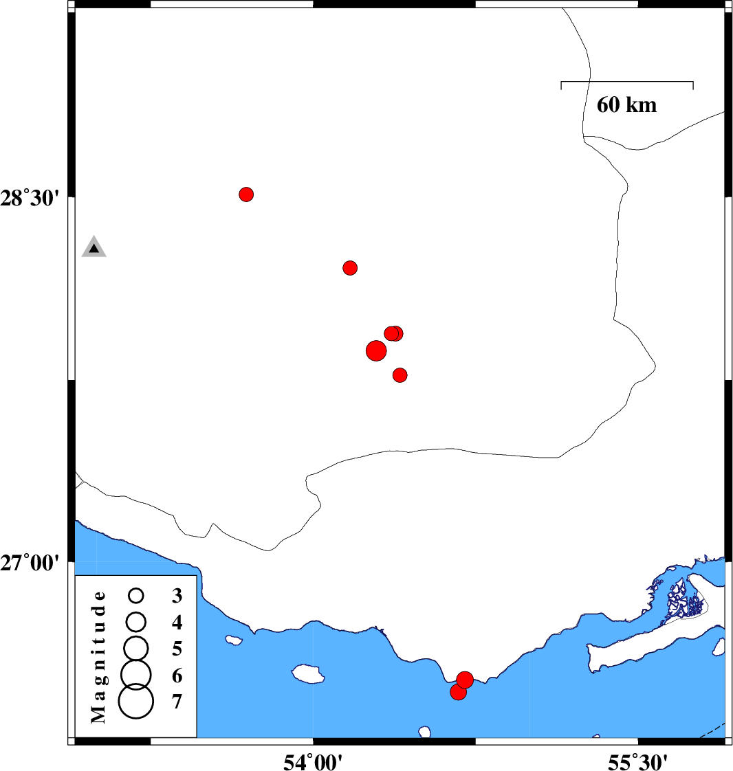 | 2010/06/21 | 22:31:16.3 | 03:01:16.3 | 27.77 | 54.4 | 46 | ML3 | Fars Province, 12 km Lar | ||