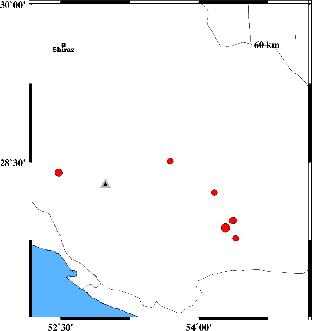 | 2010/06/20 | 19:11:50.8 | 23:41:50.8 | 27.94 | 54.38 | 15 | ML3.1 | Fars Province, 29 km North of Lar | ||