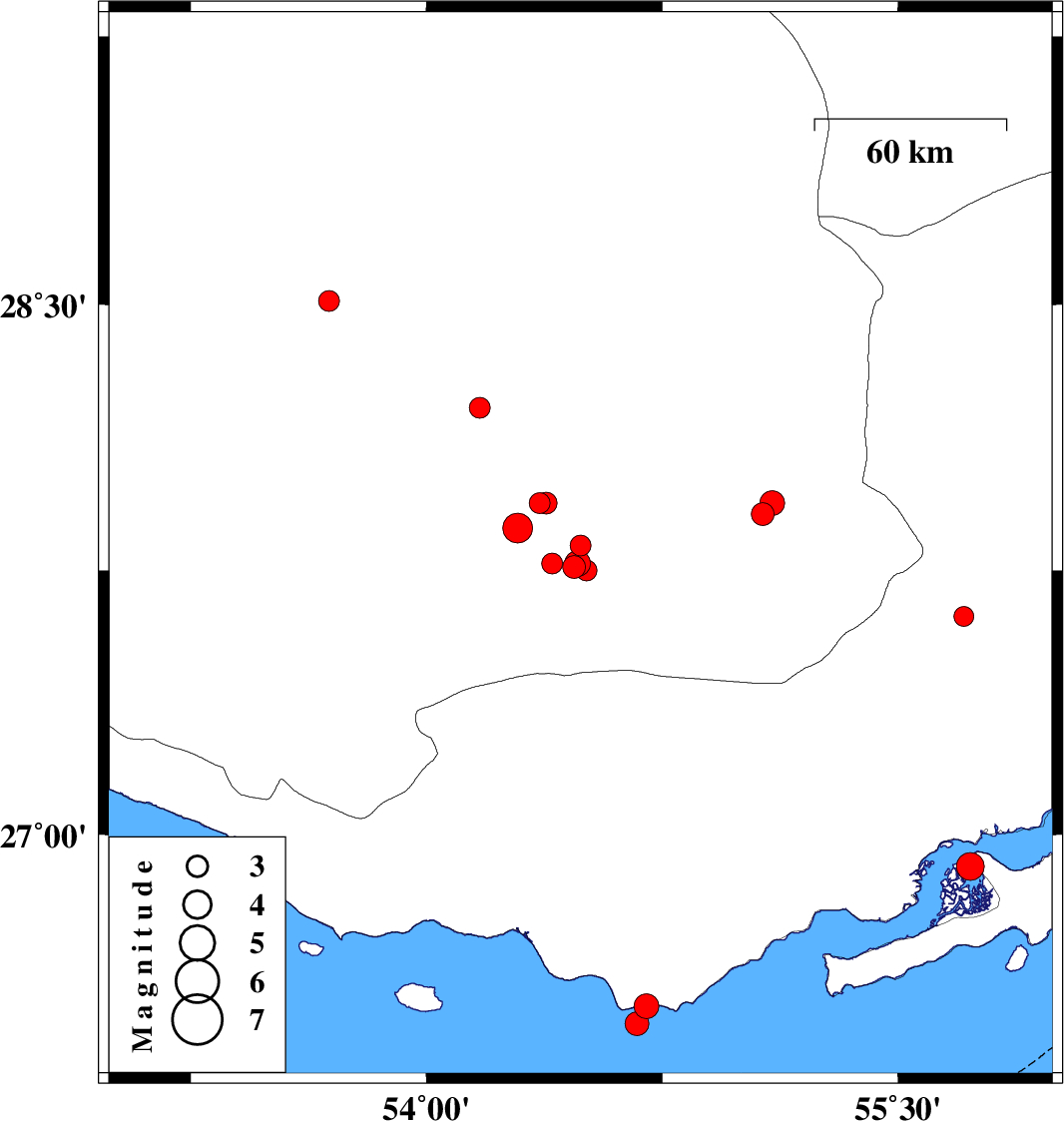2010/05/28 | 11:16:55.1 | 15:46:55.1 | 26.91 | 55.73 | 6 | ML:4 | Persian Gulf, 53 km West of Qeshm | ||